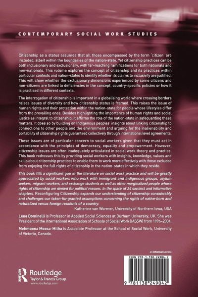 Citizenship as a status assumes that all those encompassed by the term 'citizen' are included, albeit within the boundaries of the nation-state. Yet citizenship practices can be both inclusionary and exclusionary, with far-reaching ramifications for both nationals and non-nationals. This volume explores the concept of citizenship and its practices within particular contexts and nation-states to identify whether its claims to inclusivity are justified. This will show whether the exclusionary dimensions experienced by some citizens and non-citizens are linked to deficiencies in the concept, country-specific policies or how it is practised in different contexts. The interrogation of citizenship is important in a globalising world where crossing borders raises issues of diversity and how citizenship status is framed. This raises the issue of human rights and their protection within the nation-state for people whose lifestyles differ from the prevailing ones. Besides highlighting the importance of human rights and social justice as integral to citizenship, it affirms the role of the nation-state in safeguarding these matters. It does so by building on Indigenous peoples' insights about linking citizenship to connections to other people and the environment and arguing for the inalienability and portability of citizenship rights guaranteed collectively through international level agreements. These issues are of particular concern to social workers given that they must act in accordance with the principles of democracy, equality and empowerment. However, citizenship issues are often inadequately articulated in social work theory and practice. This book redresses this by providing social workers with insights, knowledge, values and skills about citizenship practices to enable them to work more effectively with those excluded from enjoying the full rights of citizenship in the nation-states in which they reside.