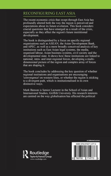 Notes on Contributors Acknowledgements List of Abbreviations List of Figures List of Tables Introduction 1. Theorising Institutional Change in East Asia Mark Beeson Part I. Institutions 2. Developmental States in Crisis S. Javed Maswood 3. The East Asian Financial Crisis: Midwife to a Movement? Nicola Bullard 4. The Implications of the Asian Crisis for Media Control in Asia Gary Roddan 5. Social Security Institutions in Southeast Asia after the Crisis Mukul G. Asher 6. The Rule of Law and Governance in East Asia Kanishka Jawasuriya 7. Social Movement Unionism in East Asia? Regional and South Korean Union Responses to the Crisis Patricia Ranald 8. Capitalism in East Asia: The Political Economy of Business Organisation in Japan, Korea and China Mark Beeson and Leong Liew Part II. Organisations 9. The ASEAN Regional Forum: Material and Ideational Dynamics Cameron J. Hill and William T. Tow 10. ASEAN: The Challenges of Organisational Reinvention Mark Beeson 11. The Asian Development Bank: Time to Wind It Up? Edward J. Lincoln 12. Institutional Evolution at the Trans-Regional Level: APEC and the Promotion of Liberalisation John Ravenhill 13. Conclusion: The More Things Change? Path Dependency and Convergence in East Asia Mark Beeson Index