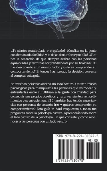 ¿Te sientes manipulado y engañado? ¿Confías en la gente con demasiada facilidad y te dejas deslumbrar por ella? ¿Tienes la sensación de que siempre acabas con las personas equivocadas y terminas sorprendiéndote por su frialdad? ¿O has descubierto a un manipulador y quieres comprender su comportamiento? Entonces has tomado la decisión correcta al comprar esta guía. En muchas personas acecha un lado oscuro. Utilizan trucos psicológicos para manipular a las personas que les rodean y enfrentarlas entre sí. Utilizan a la gente con frialdad para conseguir sus propios objetivos y rara vez sienten remordimientos o se arrepienten. ¿Tú también has tenido experiencias con personas de corazón frío y quieres comprender su comportamiento? Esta guía te dará respuestas a todas tus preguntas sobre la psicología oscura. Aprenderás todo sobre el lado oscuro de la psicología. En qué consiste y cómo reconocer a las personas con un lado oscuro.
