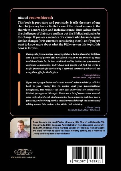 This book is part-story and part-study. It tells the story of one church's journey from a limited view of women's role in the church to a more open and inclusive stance. Russ Adcox shares the challenges of that story and lays out the Biblical rationale for the change. If you are a member of a church who has undergone similar changes (or is currently considering them), or if you just want to know more about the Bible says on this topic, this book is for you.