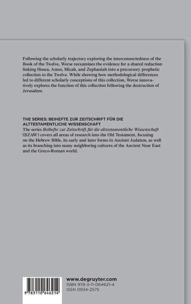 Although many scholars recognize literary similarities between Hosea, Amos, Micah, and Zephaniah, defining the compositional relationship between these texts remains a matter of debate. Following the scholarly trajectory of exploring the compositional relationship between the Twelve prophets, several scholars argue that these four prophetic texts formed a precursory collection to the Book of the Twelve. Yet even among advocates for this 'Book of the Four' there remain differences in defining the form and function of the collection. By reexamining the literary parallels between these texts, Werse shows how different methodological convictions have led to the diverse composition models in the field today. Through careful consideration of emerging insights in the study of deuteronomism and scribalism, Werse provides an innovative composition model explaining how these four texts came to function as a collection in the wake of the traumatic destruction of Jerusalem. This volume explores a historic function of these prophetic voices by examining the editorial process that drew them together.