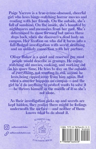 Paige Yarrow is a true-crime-obsessed, cheerful girl who loves binge-watching horror movies and reading with her friends. On the outside, she's full of sunshine. On the inside, she's haunted by nightmares and memories from her past. She's determined to move forward but moves three steps back when she discovers a dead body on campus. Her fixation on who did it turns into a full-fledged investigation with secret sleuthing and an unlikely connection with her partner. Oliver Baker is a quiet and reserved guy most people would describe as grumpy. He enjoys watching old movies, cooking, and working out in his spare time. He tries to stay on the outside of everything, not wanting to risk anyone he loves being ripped away from him again. But when a murder happens on campus-and the girl he'd do anything to protect wants to solve it-he throws himself in the middle of it so she's not alone. As their investigation picks up and secrets are kept hidden, they realize there might be feelings underneath the surface-and neither of them knows what to do about it.