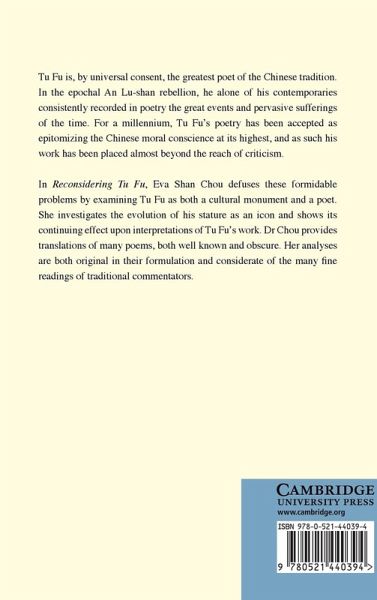 Tu Fu is, by universal consent, the greatest poet of the Chinese tradition. In the epochal An Lushan rebellion, he alone of his contemporaries consistently recorded in poetry the great events and pervasive sufferings of the time. For a millennium now, Tu Fu's poetry has been accepted as epitomizing the Chinese moral conscience at its highest, and as such his work has been placed almost beyond the reach of criticism. Indeed, objectivity about Tu Fu has often been viewed as criticism of him. In Reconsidering Tu Fu, Eva Shan Chou proposes that these thorny problems be met by separating his legacy into two distinct but related aspects: as cultural monument and as a great and original poet. Examining Tu Fu as cultural icon, she investigates the evolution and nature of his reputation and shows its continuing effect upon interpretations of his poetry. In her discussions of the poetic legacy, she introduces concepts relating to subject matter, style, genre, structure, theme, and voice, in order to provide for a fruitful reconsideration of his poetry. Many poems are discussed, both well known and less familiar. Dr. Chou's analyses are original in their formulation and also considerate of the many fine readings of traditional commentators.