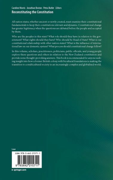All nation states, whether ancient or newly created, must examine their constitutional fundamentals to keep their constitutions relevant and dynamic. Constitutional change has greater legitimacy when the questions are debated before the people and accepted by them. Who are the peoples in this state? What role should they have in relation to the government? What rights should they have? Who should be Head of State? What is our constitutional relationship with other nation states? What is the influence of international law on our domestic system? What process should constitutional change follow? In this volume, scholars, practitioners, politicians, public officials, and young people explore these questions and others in relation to the New Zealand constitution and provide some thought-provoking answers. This book is recommended for anyone seeking insight into how a former British colony with bicultural foundations is making the transition to a multicultural society in an increasingly complex and globalised world.