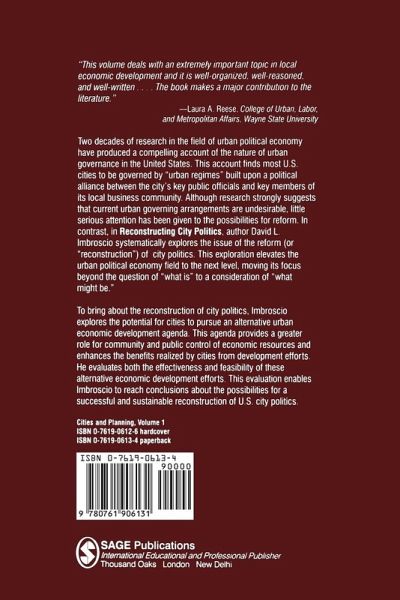 In this book, David L Imbroscio urges that urban political economy must move forward beyond the question of `what is?' to a consideration of `what might be'. He systematically poses the possibilities for reconstructing the nature of contemporary city politics, while integrating a wealth of innovative urban analysis. The author explores three alternative urban economic development strategies: entrepreneurial mercantilism, community-based economic development and municipal enterprise. He considers whether these strategies are likely to be effective for bringing about urban economic vitality and whether it is feasible for cities to pursue these efforts in the current political economic context. By addressing these questions, Imbroscio reaches conclusions about the possibilities for a successful and sustainable reconstruction of US city politics.