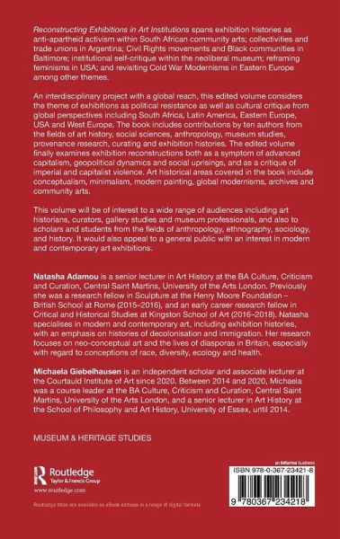 Reconstructing Exhibitions in Art Institutions spans exhibition histories as anti-apartheid activism within South African community arts; collectivities and trade unions in Argentina; Civil Rights movements and Black communities in Baltimore; institutional self-critique within the neoliberal museum; reframing feminisms in USA; and revisiting Cold War Modernisms in Eastern Europe among other themes. An interdisciplinary project with a global reach, this edited volume considers the theme of exhibitions as political resistance as well as cultural critique from global perspectives including South Africa, Latin America, Eastern Europe, USA and West Europe. The book includes contributions by ten authors from the fields of art history, social sciences, anthropology, museum studies, provenance research, curating and exhibition histories. The edited volume finally examines exhibition reconstructions both as a symptom of advanced capitalism, geopolitical dynamics and social uprisings, and as a critique of imperial and capitalist violence. Art historical areas covered in the book include conceptualism, minimalism, modern painting, global modernisms, archives and community arts. This volume will be of interest to a wide range of audiences including art historians, curators, gallery studies and museum professionals, and also to scholars and students from the fields of anthropology, ethnography, sociology, and history. It would also appeal to a general public with an interest in modern and contemporary art exhibitions.