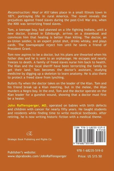 Reconstruction: Heal or Kill takes place in a small Illinois town in 1871, portraying life in rural America. The novel reveals the prejudices against freed slaves during the post-Civil War era, when the KKK was terrorizing freed slaves. Tom, a teenage boy, had planned on a life fighting Indians, until a new doctor, trained in Edinburgh, arrives on a steamboat and convinces him that healing is better than killing. The doctor, an ex-Union soldier, is an expert pistol shot, drinks whisky, and plays cards. The townspeople reject him until he saves a friend of President Grant. Tom now aspires to be a doctor, but his plans are thwarted when his father dies and he is sent to an orphanage. He escapes and nearly freezes to death. A family of freed slaves nurse him back to health. The Klan and the local sheriff have been terrorizing the family to get their land. Tom becomes the doctor's assistant, studying medicine by digging up a skeleton to learn anatomy. He is also there to protect a freed slave from lynching. Bullets fly when the doctor takes on the leader of the Klan. Tom and his friend break up a Klan meeting, but in the melee, the Klan murders a Negro boy. In the end, Tom and the doctor operate on the Klan leader for a gunshot wound, showing that a doctor must first be a healer. About The Author: John Raffensperger, MD, operated on babies with birth defects and children with cancer for nearly fifty years. He taught students and residents while finding time to write medical textbooks. After retiring, he is now writing historic fiction with a medical theme.
