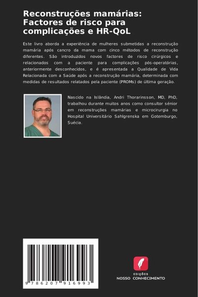 Este livro aborda a experiência de mulheres submetidas a reconstrução mamária após cancro da mama com cinco métodos de reconstrução diferentes. São introduzidos novos factores de risco cirúrgicos e relacionados com a paciente para complicações pós-operatórias, anteriormente desconhecidos, e é apresentada a Qualidade de Vida Relacionada com a Saúde após a reconstrução mamária, determinada com medidas de resultados relatados pela paciente (PROMs) de última geração.