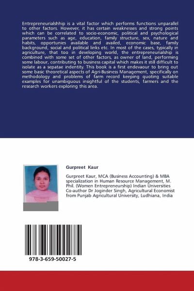 Entrepreneurialshhip is a vital factor which performs functions unparallel to other factors. However, it has certain weaknesses and strong points which can be correlated to socio-economic, political and psychological parameters such as age, education, family structure, sex, nature and habits, opportunies available and availed, economic base, family background, social and political links etc. In most of the cases, typically in agriculture, that too in developing world, the entrepreneurialship is combined with some set of other factors, as owner of land, performing some labour, contributing to business capital which makes it still difficult to isolate as a sepatae indentity. This book is a first endevaour to bring out some basic theoretical aspects of Agri-Business Management, specifically on methodology and problems of farm record keeping quoting suitable examples for unambiguous insightful of the students, farmers and the research workers exploring this area.