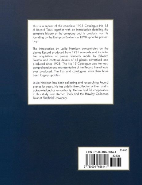 This is a reprint of the complete 1938 Catalogue No 15 of Record Tools together with an introduction detailing the complete history of the company and its products from its founding by the Hampton Brothers in 1898 through the acquisition of the Preston List in the early 1930s to the present day Record Tools. The introduction by Leslie Harrison concentrates on the planes Record produced from 1931 onwards and includes the acquisition of planes formerly made by Edward Preston; and it contains details of all planes advertised and produced since 1938. This No 15 Catalogue was the most comprehensive and representative of the Record line of tools ever produced. The lists and catalogues since then have been largely updates. This volume is printed on high-quality gloss paper and includes illustrations of the tools and parts throughout the text. Appropriate patent documents are included. The catalogue is divided into six sections: Planes and Spoke Shaves; Hand & Breast Drills; Vices for Metal and Wood; Pipe Vices, Wrenches, & Cutters; Bolt Clippers, and Cramps. Leslie Harrison has been collecting and researching Record planes for years. He has a definitive collection of them and is acknowledged as an authority. He has had full cooperation in this study from Record Tools and the Hawley Collection Trust at Sheffield University. Hundreds of B&W images