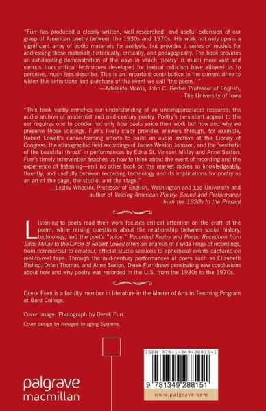 "This book vastly enriches our understanding of an underappreciated resource: the audio archive of modernist and mid-century poetry. Poetry's persistent appeal to the ear requires one to ponder not only how poets voice their work but how and why we preserve those voicings. Furr's lively study provides answers through, for example, Robert Lowell's canon-forming efforts to build an audio archive at the Library of Congress, the ethnographic field recordings of James Weldon Johnson, and the 'aesthetic of the beautiful throat' in performances by Edna St. Vincent Millay and Anne Sexton. Furr's timely intervention teaches us how to think about the event of recording and the experience of listening - and no other book on the market moves so knowledgeably, fluently, and usefully between recording technology and its implications for poetry as an art of the page, the studio, and the stage." - Lesley Wheeler, Professor of English, Washington and Lee University and author of Voicing American Poetry: Sound and Performance from the 1920s to the Present