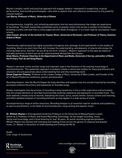 Recording Analysis: How the Record Shapes the Song identifies and explains how the sounds imparted by recording processes enhance the artistry and expression of recorded songs. Moylan investigates how the process of recording a song transforms it into a richer experience and articulates how the unique elements of recorded sound provide essential substance and expression to recorded music. This book explores a broad array of records, evaluating the music, lyrics, social context, literary content and meaning, and offers detailed analyses of recording elements as they appear in a wide variety of tracks. Accompanied by a range of online resources, Recording Analysis is an essential read for students and academics, as well as practitioners, in the fields of record production, song-writing and popular music.