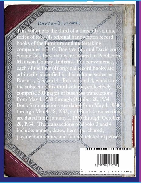 This volume is the third of a three (3) volume series of four (4) original handwritten record books of the furniture and undertaking companies of I. G. Davis & Co. and Davis and Sloane Co., Inc., that were located in Pendleton, Madison County, Indiana. For convenience, each of the four (4) original record books are arbitrarily identified in this volume series as Books 1, 2, 3, and 4. Books 3 and 4, which are the subject of this third volume, collectively comprise 503 pages of business transactions from May 1, 1930 through October 20, 1934. Book 3 transactions are dated from May 1, 1930 through March 18, 1932, and Book 4 transactions are dated from January 1, 1930 through October 20, 1934. The transactions of Books 3 and 4 include: names, dates, items purchased, payment amounts, and funeral related expenses.