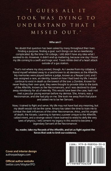 Who am I? No doubt that question has been asked by many throughout their lives. Finding a purpose, finding a goal; such things can be so needlessly complicated. By the time I hit college, I still didn't have any idea what I wanted to do. However, it didn't end up mattering, because one day I found my life coming to a swift and tragic end. Travis White died of a heart attack outside of a gas station. That's not where my story ended, though. As I awoke from my collapse, I found myself whisked away to a land known to all denizens as the Afterlife. My memories were played before a judge, known as a Reaper Lord, and I was assigned a race, an identity, based on how I had lived my life. I would continue to exist in death as the lowest of the low: a Zombie. Known for never finding their own goal, they were thought to provide little to the lords of the Afterlife, known as the Necromancers, and I was destined to slave away mindlessly for all of eternity. This would have been the case, had I not met a peculiar young woman before my demise. She, Amara, was a Necromancer, and she had pity on me. She took me away from that place and asked me to be her Servant. Now, I trained to fight and serve. My life may not have had any meaning, but my death would not be the same. Amara had taken the time to train me to combat the dark influences of the other Necromancer, Arius, and his angels of death, the Azraels. Learning to harness a power unique to the Afterlife, called intent, and a strange sword I have learned to wield to defy the very laws of physics; I will cement my legacy in this world to become a legendary Servant of the Necromancer. So, reader, take my Records of the Afterlife, and let us fight against the forces that seek to limit our existence.