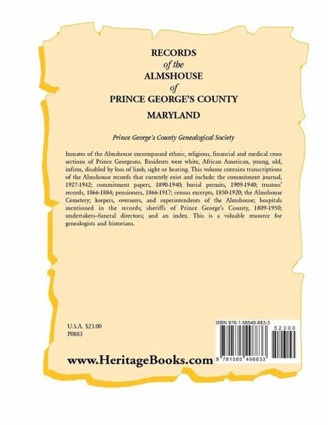 Inmates of the Almshouse encompassed ethnic, religious, financial and medical cross sections of Prince Georgeans. Residents were white, African American, young, old, infirm, disabled by loss of limb, sight or hearing. This volume contains transcriptions of the Almshouse records that currently exist and include: Commitment Journal, 1927-1942; Commitment Papers, 1890- 1940; Burial Permits, 1909-1940; Trustees Records, 1866-1884; Pensioners, 1866-1917; Census Excerpts, 1850-1920; Almshouse Cemetery; Keepers, Overseers, and Superintendents of the Almshouse; Hospitals mentioned in the records; Sheriffs of Prince George's County, 1809-1950; Undertakers - Funeral Directors; and an index. A valuable resource for genealogists and historians.