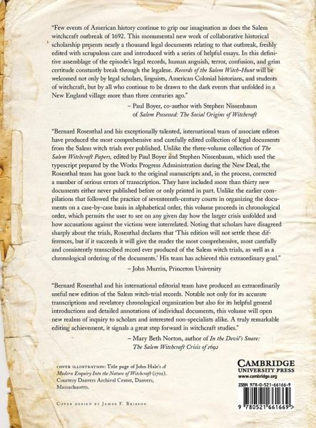 This book represents a comprehensive record of all legal documents pertaining to the Salem witch trials, in chronological order. Numerous manuscripts, as well as records published in earlier books that were overlooked in other editions, offer a comprehensive narrative account of the events of 1692-3, with supplementary materials stretching as far as the mid-18th century. The book can be used as a reference book or read as an unfolding narrative. All legal records are newly transcribed, and included in this edition is a historical introduction, a legal introduction, and a linguistic introduction. Manuscripts are accompanied by notes that, in many cases, identify the person who wrote the record. This has never been attempted, and much is revealed by seeing who wrote what, when.