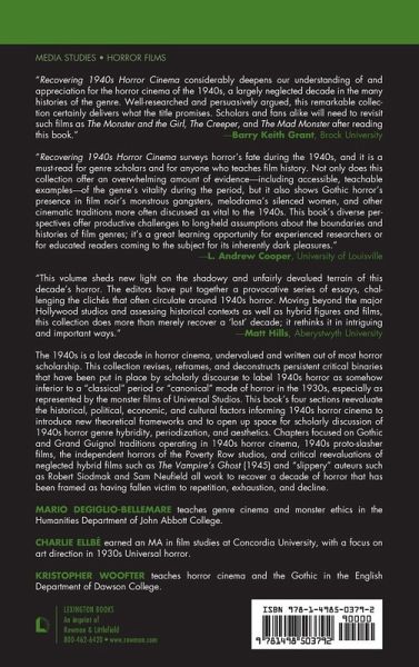 The 1940s is a lost decade in horror cinema, undervalued and written out of most horror scholarship. This collection revises, reframes, and deconstructs persistent critical binaries that have been put in place by scholarly discourse to label 1940s horror as somehow inferior to a "classical" period or "canonical" mode of horror in the 1930s, especially as represented by the monster films of Universal Studios. The book's four sections re-evaluate the historical, political, economic, and cultural factors informing 1940s horror cinema to introduce new theoretical frameworks and to open up space for scholarly discussion of 1940s horror genre hybridity, periodization, and aesthetics. Chapters focused on Gothic and Grand Guignol traditions operating in forties horror cinema, 1940s proto-slasher films, the independent horrors of the Poverty Row studios, and critical reevaluations of neglected hybrid films such as The Vampire’s Ghost (1945) and "slippery" auteurs such as Robert Siodmak and Sam Neufield, work to recover a decade of horror that has been framed as having fallen victim to repetition, exhaustion, and decline.