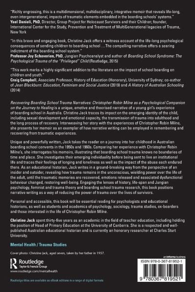 Recovering Boarding School Trauma Narratives: Christopher Robin Milne as a Psychological Companion on the Journey to Healing is a unique, emotive and theorised narrative of a young girl's experience of boarding school in Australia. Christine Jack traces its impact on the emerging identity of the child, including sexual development and emotional capacity, the transmission of trauma into adulthood and the long process of recovery. Interweaving her story with the experiences of Christopher Robin Milne, she presents her memoir as an exemplar of how narrative writing can be employed in remembering and recovering from traumatic experiences. Unique and powerfully written, Jack takes the reader on a journey into her childhood in Australian boarding school convents in the 1950s and 1960s. Comparing her experience with Christopher Robin Milne's, she interrogates his memoirs, illustrating that boarding school trauma knows no boundaries of time and place. She investigates their emerging individuality before being sent to live an institutional life and traces their feelings of longing and loneliness as well as the impact of the abuse each endured there. As an educational historian, Jack writes in a ground-breaking way from the perspective of an insider and outsider, revealing how trauma remains in the unconscious, wielding power over the life of the adult, until the traumatic memories are recovered, emotions released and associated dysfunctional behaviour changed, restoring well-being. Engaging the lenses of history, life-span and Jungian psychology, feminist and trauma theory and boarding school trauma research, this book positions narrative writing as a way of reducing the power of trauma over the lives of survivors. Personal and accessible, this book will be essential reading for psychologists and educational historians, as well as students and academics of psychology, sociology, trauma studies, ex-boarders and those interested in the life of Christopher Robin Milne.