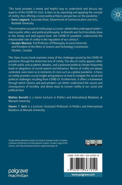 This Open Access book examines many of the challenges posed by the COVID-19 pandemic through the distinctive lens of civility. The idea of civility appears often in both public and academic debates, and a polarized political climate frequently leads to allegations of uncivil speech and behaviour. Norms of civility are always contested, even more so in moments of crisis such as a global pandemic. A focus on civility provides crucial insight and guidance on how to navigate the social and political challenges resulting from COVID-19. Furthermore, it offers a framework through which citizens and policymakers can better understand the causes and consequences of incivility, and devise ways to recover civility in our social and political lives.