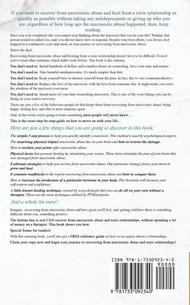 If you want to recover from narcissistic abuse and heal from a toxic relationship as quickly as possible without taking any antidepressants or giving up who you are..regardless of how long ago the narcissistic abuse happened, then, keep reading.. Have you ever wondered why you cannot stop thinking about the narcissist that was in your life? Perhaps that person texted or called you, and, you did not know how to respond. Despite your best efforts, you always feel trapped in a continuous cycle and stuck on your journey to recovering from narcissistic abuse. Here's the deal: Recovering from narcissistic abuse and healing from a toxic relationship doesn't have to be difficult. Even if you've tried other solutions which didn't work before. This book is the solution. You don't need to: Spend hundreds of dollars and countless hours on counseling. Save your time and money. You don't need to: Take harmful antidepressents. It's much simpler than that. You don't need to: Keep yourself busy to distract yourself from the pain. In fact, this is very counterproductive. You don't need to: Replace the love of the narcissist, with the love from someone else. It might make you crave the attention of the narcissist even more. You don't need to: Spend more of your time researching narcissists. This is one of the worst things you can be doing on your road to recovery. Those are just a few of the behaviors people do that keeps them from recovering from narcissistic abuse, being happy, feeling free, and able to trust someone again.. And, in this book you're going to learn something most people will never know... This is the exact step-by-step guide on how to move on with your life... Here are just a few things that you are going to discover in this book: The simple 3 step process to help you quickly identify a narcissist. This method is used by psychological experts. The surprising physical impact narcissistic abuse has on your brain and how to reverse the damage. How to reclaim your power after narcissistic abuse. Physical items that promote healing by stimulating your senses. These items stimulate the part of your brain that was damaged from narcissistic abuse. 8 ultimate strategies to help you recover from narcissistic abuse. One particular strategy forces your brain to grow and heal. 8 common roadblocks to the road to recovering from narcissistic abuse and how to conquer them. How to increase the production of a particular hormone in your body. This hormone will increase your self esteem and confidence. A little-known healing technique created by a psychologist that you can do all on your own without a therapist. These are the same techniques utilized by PTSD patients. And a whole lot more! The bottom line is you CAN recover from narcissistic abuse and toxic relationships, without spending a lot of money on a therapist. This book shows you how. Special bonus for readers! With this amazing book, you'll also get a FREE reference guide on how to recognize abusive relationships. So if you are ready to recover from narcissistic abuse and invest in your well-being, then claim your copy right now!