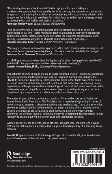 Transatlantic policing is experiencing an unprecedented crisis of legitimacy, epitomised by public responses to the murders of George Floyd and Sarah Everard during the COVID-19 pandemic. Legitimacy is lost when the police either fail to protect the public or rely on coercion rather than consent to achieve that protection. Recovering Police Legitimacy challenges conventional criminological, political, and public solutions to the problem by approaching it from the bottom up, beginning with policing as a practice constituted by a unique set of excellences, skills, and characteristics.