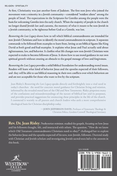 At first, Christianity was just another form of Judaism. The first non-Jews who joined the movement were a minority in a Jewish community—considered "resident aliens" among the people of Israel. The expectations in the Scriptures for Gentiles among the people were the basis for welcoming Gentiles into the early church. When the majority of people in the church no longer shared Jewish law and customs, the memory of what it meant to be non-Jewish in a Jewish community, to be righteous before God as a Gentile, was lost. Recovering the Lost Legacy shows how to tell which biblical commandments are intended for non-Jewish Christians and how to identify the moral commandments in scripture. It separates commands to be followed from examples to learn from, letting us see biblical figures like King David as both good and bad examples. It explains what Jesus and Paul actually said about righteousness, law, and behavior. It clarifies what life changes new non-Jewish Christians were expected to make to become followers of Jesus. It shows how to use moral guidance in our own spiritual growth without creating an obstacle to the gospel message of love and forgiveness. Recovering the Lost Legacy provides a solid biblical foundation for understanding moral issues. Readers will learn what kind of behavior Jesus and the apostles expected of their followers, and they will be able to use biblical reasoning in their own conflicts over which behaviors are and are not acceptable for those who want to live by the scripture. Jean Risley’s Recovering the Lost Legacy speaks directly and forthrightly into a vital need in today’s churches: the need for concrete moral guidance for Christian living and mission, informed by the revealed moral laws of the Old and New Testaments. Risley pinpoints many of the confusions and misunderstandings of the nature of biblical law and its purposes, and provides practical suggestions for connecting these principles in the life of the church. I commend it warmly to all pastors and church leaders who seek a more comprehensive theological basis for Christian discipleship today. —John Jefferson Davis, Professor of Systematic Theology & Christian Ethics, Gordon-Conwell Theological Seminary