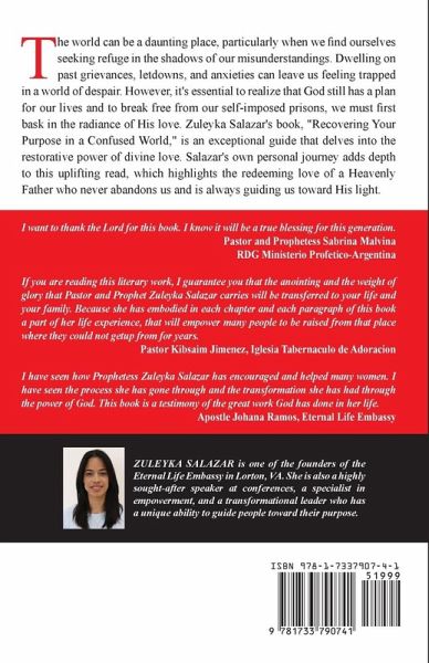 The world can be a daunting place, particularly when we find ourselves seeking refuge in the shadows of our misunderstandings. Dwelling on past grievances, letdowns, and anxieties can leave us feeling trapped in a world of despair. However, it is essential to realize that God still has a plan for our lives, and to break free from our self-imposed prisons, we must first bask in the radiance of His love. Zuleyka Salazar's book, "Recovering Your Purpose in a Confused World," is an exceptional guide that delves into the restorative power of divine love. Salazar's own personal journey adds depth to this uplifting read, which highlights the redeeming love of a Heavenly Father who never abandons us and is always guiding us toward His light. I want to thank the Lord for this book. I know it will be a true blessing for this generation. Pastor and Prophetess Sabrina Malvina RDG Ministerio Profetico-Argentina If you are reading this literary work, I guarantee you that the anointing and the weight of glory that Pastor and Prophet Zuleyka Salazar carries will be transferred to your life and your family. Because she has embodied in each chapter and each paragraph of this book a part of her life experience, that will empower many people to be raised from that place where they could not get up from for years. Pastor Kibsaim Jimenez, Iglesia Tabernaculo de Adoracion I have seen how Prophetess Zuleyka Salazar has encouraged and helped many women. I have seen the process she has gone through and the transformation she has had through the power of God. This book is a testimony of the great work God has done in her life. Apostle Johana Ramos, Eternal Life Embassy Zuleyka Salazar is a founder of the Eternal Life Embassy in Lorton, VA. She is also a highly sought-after speaker at conferences, a specialist in empowerment, and a transformational leader who has a unique ability to guide people toward their purpose.