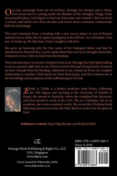One day, seemingly from out of nowhere, through two dreams and a vision, God moves me to a setting under the Shadow of His Almighty Wings. From this peaceful place, God begins to heal me from pain and wounds I did not know I carried, and which over three decades and across three continents continuously held me in bondage. This past emanated from a breakup with a star soccer player in one of Kenya's national soccer clubs. He was open to polygamy to be with me. As a Christian, I was not; we broke up. By that time, I had a daughter with him. She grew up knowing only the first name of her biological father and that he abandoned us. Beyond this, I never spoke about him and never thought about him. Unknown to me, I did not heal from the breakup. Three decades later, I received a visitation from God. Through the Holy Spirit talking to me as a person right next to me, Christ recovers this past I long buried, reveals to me how wounds from the breakup, unknown to me, tossed me from one complex relationship to another. Christ heals me from these pains, and then restores me to the knowledge and acceptance of the sufficient grace of God. Edith A. Chillo is a history professor from Kenya. Following her MA degree and teaching at the University of Nairobi in Kenya, she moved to Australia, where she completed her doctorate, and then moved to work in the USA. She is a Christian, but as an academic, she writes academic works. She wrote this Christian book following instructions from the Holy Spirit to write it for the glory of God. Publisher's website: http://sbprabooks.com/EdithAChillo