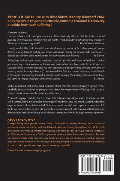 What is it like to live with dissociative identity disorder? How does the brain respond to chronic, extreme trauma? Is recovery possible from such suffering? In this combined first and second volumes of her collected essays, Carolyn Spring writes candidly from a number of perspectives about her experiences of living with trauma-related dissociation, and her journey of recovery over ten years. Topics covered include such as shame, denial, child sexual abuse, the complex meanings of ‘madness’ and the multi-layered subjective experience of a dissociative mind. It is a series of standalone chapters or essays which build on one another to provide not only a unique insight into trauma, attachment and dissociation, but also the long and arduous – but ultimately fulfilling – recovery journey. REVIEWS "A powerful, insightful read. Carolyn’s honest, brave, intelligent and poetically written essays about living with and recovering from DID are a real gift. I read it from cover to cover, and then began all over again." "Superbly helpful. This book is excellent both as a resource for professionals and a helpful aid to accompany those recovering from trauma, from someone who has pieced their life back together. It’s been one of the most helpful books for myself as someone recovering with DID to see so much of my confusion mirrored and explained and then reassured with options and working strategies." "Inspires hope. Beautifully and intelligently written, giving hope and optimism for the future for all trauma survivors, and a must read for therapists." "Inspiring. This book was both interesting and inspirational in both content and subject matter. Having heard the author teach, I can vouch for her eloquence as much in writing now as in her spoken word. Her message is one to be spread. Her experiences and journey of self-awareness and acceptance give others hope and therapists a unique insight into trauma work." "Beautiful. Such poignancy and elegantly written, an inspiration to recovery, its journey and what that can look like. Thank you – it’s great to feel connected and seen." "Excellent. This is an amazing account and glimpse into the world of someone who suffers with dissociative identity disorder as a result of extreme childhood trauma and the recovery process. Excellently written, poignant, challenging at times. Wonderful insight into the therapeutic process from the client’s perspective. I have gained so much from reading this. Highly recommended."