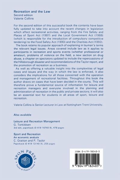 For the second edition of this successful book the contents have been fully updated to take into account recent changes in legislation affecting recreational activities. It also considers the implications for all those concerned with the operation and management of recreational facilities.