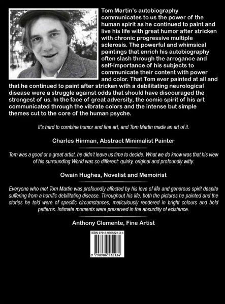 Tom Martin's autobiography communicates to us the power of the human spirit as he continued to paint and live his life with great humor after stricken with chronic progressive multiple sclerosis. The powerful and whimsical paintings that enrich his autobiography often slash through the arrogance and self-importance of his subjects to communicate their content with power and color. That Tom ever painted at all and that he continued to paint after stricken with a debilitating neurological disease were a struggle against odds that should have discouraged the strongest of us. In the face of great adversity, the comic spirit of his art communicated through the vibrate colors and the intense but simple themes cut to the core of the human psyche.