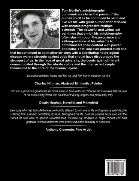 Tom Martin's autobiography communicates to us the power of the human spirit as he continued to paint and live his life with great humor after stricken with chronic progressive multiple sclerosis. The powerful and whimsical paintings that enrich his autobiography often slash through the arrogance and self-importance of his subjects to communicate their content with power and color. That Tom ever painted at all and that he continued to paint after stricken with a debilitating neurological disease were a struggle against odds that should have discouraged the strongest of us. In the face of great adversity, the comic spirit of his art communicated through the vibrate colors and the intense but simple themes cut to the core of the human psyche.