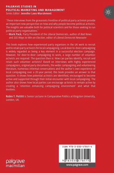 This book explores how experienced party organisers in the UK work to recruit and to retain party activists for local campaigning. Local door-to-door campaigning is widely regarded as being a key element in a successful election campaign. However, for door-to-door campaigning to work, a large number of volunteer activists are required. The question then is: How can parties identify, recruit and retain such volunteer activists? Based on interviews with highly experienced campaigners, original party documents, the wider campaigning and volunteering literature, numerous informal conversations and the author's own experience of local campaigning over a 20 year period, this book provides an answer to that question. It shows how potential activists are identified, encouraged to become active and supported through their initial encounter with local campaigning. The author also shows how local parties can encourage activists to remain active by creating a 'retention enhancing campaigningenvironment' and what that involves.