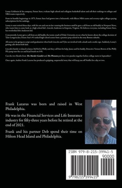 Lenny Goldstein & his company, Future Stars, evaluate high school and collegiate basketball talent and sell their rankings to colleges and NBA teams respectively. From its humble beginnings in 1975, Future Stars had grown into a behemoth, with fifteen NBA teams and seventy-eight colleges paying subscriptions for his rankings. Lenny is semi-retired these days, with his son and son-in-law running the business until he gets a call from an old buddy in Newport News, who wants him to come look at a high school kid , Lincoln Anderson in Emporia, Virginia. He believes everyone, including Future Stars, has overlooked this Anderson kid. Concurrently, Lenny gets a call from an old buddy, the iconic coach of Duke University, to see what he knows about the college decision of Tyler Longenecker, Future Star's #5 ranked high school senior from a premier prep school in the tony Boston suburbs. All seems to be going on script until graduation when both Lincoln and Tyler are involved with a death and a roofie rape. Suddenly, Lenny's getting calls about both kids. Lincoln's family is related to James McNeil in Philly and they call him for help. James and his buddy, Detective Vernon Brown of the Philly PD, jump into the car and head South on I-95. Can the two Sleuths from The Murder Gambit and The Phenom put these two puzzles together before college starts in September? Once again, Author Frank Lazarus has produced a gripping, suspenseful story that will keep you off Netflix for a day or two.