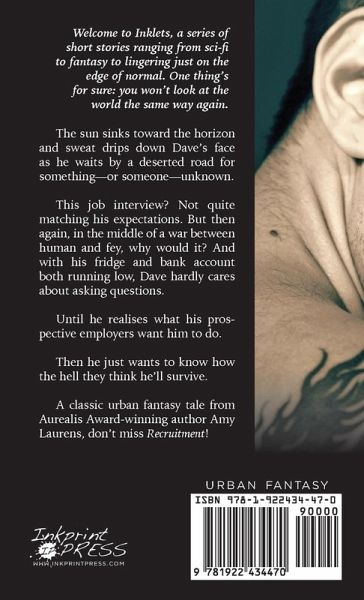 The sun sinks toward the horizon and sweat drips down Dave's face as he waits by a deserted road for something-or someone-unknown. This job interview? Not quite matching his expectations. But then again, in the middle of a war between human and fey, why would it? And with his fridge and bank account both running low, Dave hardly cares about asking questions. Until he realises what his prospective employers want him to do. Then he just wants to know how the hell they think he'll survive. A classic urban fantasy tale from Aurealis Award-winning author Amy Laurens, don't miss Recruitment!
