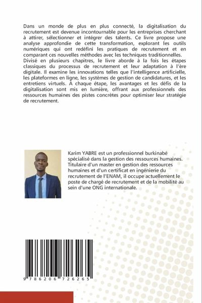 Dans un monde de plus en plus connecté, la digitalisation du recrutement est devenue incontournable pour les entreprises cherchant à attirer, sélectionner et intégrer des talents. Ce livre propose une analyse approfondie de cette transformation, explorant les outils numériques qui ont redéfini les pratiques de recrutement et en comparant ces nouvelles méthodes avec les techniques traditionnelles.Divisé en plusieurs chapitres, le livre aborde à la fois les étapes classiques du processus de recrutement et leur adaptation à l'ère digitale. Il examine les innovations telles que l'intelligence artificielle, les plateformes en ligne, les systèmes de gestion de candidatures, et les entretiens virtuels. À chaque étape, les avantages et les défis de la digitalisation sont mis en lumière, offrant aux professionnels des ressources humaines des pistes concrètes pour optimiser leur stratégie de recrutement.