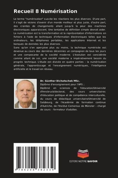 Le terme "numérisation" suscite les réactions les plus diverses. D'une part, il s'agit de visions d'avenir d'un monde meilleur et plus juste, d'autre part, des craintes de changements allant jusqu'à la peur des machines électroniques apparaissent. Une tentative de définition simple devrait aider. La numérisation est la transformation et la représentation d'informations en fichiers à l'aide de techniques d'information électroniques telles que les ordinateurs, les téléphones portables, les applications Internet et les banques de données les plus diverses. Sans qu'on s'en aperçoive plus ou moins, la technique numérisée est devenue au cours des dernières décennies un compagnon de tous les jours et une composante de la société moderne. L'évolution est considérée comme allant de soi, une société moderne a impérativement besoin du progrès technique. L'étude est divisée en quatre parties : la numérisation générale, l'apprentissage et l'enseignement numériques, l'intelligence artificielle et le travail en réseau.