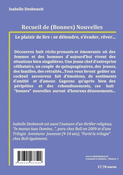 Découvrez huit récits prenants et émouvants où des femmes et des hommes d'aujourd'hui vivent des situations bien singulières.Une jeune chef d'entreprise célibataire, un couple de quinquagénaires, des jeunes, des familles, des retraités... Tous vous feront goûter un cocktail savoureux fait d'émotions, de sentiments d'amitié et d'amour. Gageons qu'après bien des péripéties et des rebondissements, ces huit "bonnes" nouvelles auront d'heureux dénouements...