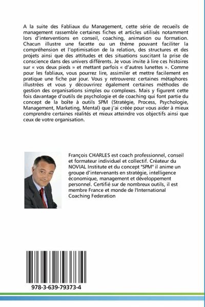 A la suite des Fabliaux du Management, cette série de recueils de management rassemble certaines fiches et articles utilisés notamment lors d interventions en conseil, coaching, animation ou formation. Chacun illustre une facette ou un thème pouvant faciliter la compréhension et l optimisation de la relation, des structures et des projets ainsi que des attitudes et des situations suscitant la prise de conscience dans des univers différents. Je vous invite à lire ces histoires sur " vos deux pieds " et mettant parfois " d autres lunettes ". Comme pour les fabliaux, vous pourrez lire, assimiler et mettre facilement en pratique une fiche par jour. Vous y retrouverez certaines métaphores illustrées et vous y découvrirez également certaines méthodes de gestion des organisations simples ou complexes. Mais y figurent cette fois davantage d outils de psychologie et de coaching qui font partie du concept de la boîte à outils SPM (Stratégie, Process, Psychologie, Management, Marketing, Mental) que j ai créée pour vous aider à mieux comprendre certaines réalités et mieux atteindre vos objectifs ainsi que ceux de votre organisation.