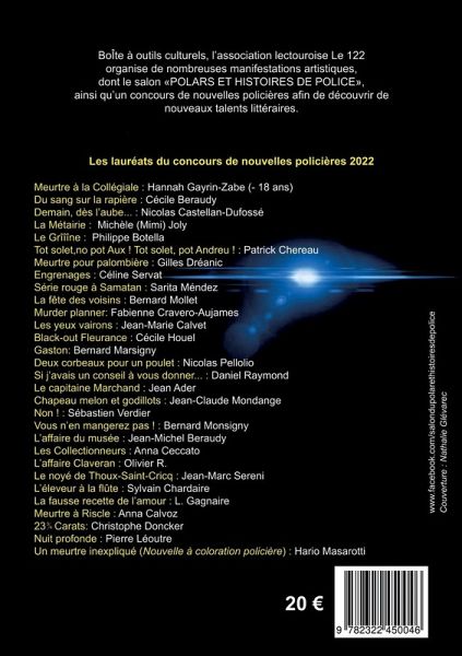L'association lectouroise "Le 122" lance son concours de nouvelles policières en langue française dont le cadre est le département du Gers.Le texte doit compter entre trois et neuf pages.Sujet libre : un crime, un délit, un méfait, une infraction, une vengeance, une tromperie, une fraude, un complot...Genre libre : énigme, mystère, texte noir, contemporain ou historique.Ce concours est gratuit et s'adresse à tous.Les participants concourent en deux catégories :jeunes : moins de 18 ansadultes : plus de 18 ansIls ont jusqu'au 30 juillet 2023 pour envoyer leur nouvelle par mail à pierre.leoutre@gmail.comLes nouvelles ne doivent pas avoir déjà été éditées ou faire l'objet d'un autre concours en cours. Les nouvelles doivent se passer dans le Gers, et avoir une longueur de 3 à 9 pages ; si ces consignes ne sont pas appliquées, la nouvelle ne sera pas prise en compte.Toutes les nouvelles sélectionnées par le comité de lecture seront éditées dans le recueil de nouvelles 2023.Les résultats seront annoncés par voie de presse et sur la page Facebook du salon polars et histoires de police (www.facebook.com/salondupolarethistoiresdepolice) organisé par l'association Le 122.Le 1er de chaque catégorie gagnera un panier gourmand de produits du Gers et le recueil en version papier.Si les participants souhaitent receboir un recueil en version numérique et aider l'association "Le 122" dans son entreprise de "découverte de nouveaux talents littéraires", ils s'adressent par mail à : pierre.leoutre@gmail.com ; un bulletin d'adhésion leur sera envoyé.À vos claviers, stylos, plumes... Le suspense est entre vos mains !
