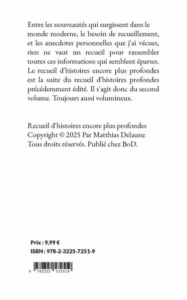 Entre les nouveautés qui surgissent dans le monde moderne, le besoin de recueillement, et les anecdotes personnelles que j'ai vécues, rien ne vaut un recueil pour rassembler toutes ces informations qui semblent éparses. Le recueil d'histoires encore plus profondes est la suite du recueil d'histoires profondes précédemment édité. Il s'agit donc du second volume. Toujours aussi volumineux.