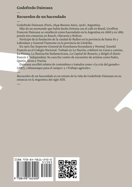 Recuerdos de un hacendado es una obra literaria de Godofredo Daireaux, escritor y educador francés, quien vivió en Argentina durante una gran parte de su vida. Este libro, publicado cerca del final de su vida, es en esencia una autobiografía que documenta su experiencia como hacendado en las vastas llanuras de La Pampa en el siglo XIX. A lo largo de Recuerdos de un hacendado, Daireaux traza una descripción detallada de la vida rural y agrícola de esa época. Pinta un cuadro del paisaje desolado pero cautivador de La Pampa, y narra sus experiencias en la gestión de su hacienda, desde la crianza de ganado hasta la siembra de cosechas. Daireaux también ofrece una mirada perspicaz a la vida social en La Pampa durante este período. Narra sus interacciones con los gauchos, los trabajadores rurales de la Argentina, y proporciona una perspectiva única sobre sus costumbres y formas de vida. Además, la obra tiene una dimensión reflexiva, donde Daireaux pondera sobre la vida, la humanidad y su papel en ella. A través de su lente, los lectores pueden obtener una comprensión más profunda de la Argentina del siglo XIX y su gente. Recuerdos de un hacendado es una crónica personal y contemplativa de la vida de Godofredo Daireaux en la Argentina rural del siglo XIX. La obra es un retrato valioso y vibrante de la vida y la cultura de La Pampa en esa época, y un testimonio del espíritu humano frente a las pruebas de la vida en la inmensidad de la llanura.