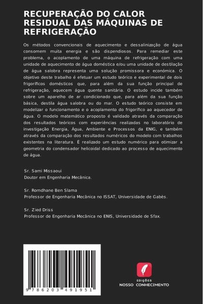Os métodos convencionais de aquecimento e dessalinização de água consomem muita energia e são dispendiosos. Para remediar este problema, o acoplamento de uma máquina de refrigeração com uma unidade de aquecimento de água doméstica e/ou uma unidade de destilação de água salobra representa uma solução promissora e económica. O objetivo deste trabalho é efetuar um estudo teórico e experimental de dois frigoríficos domésticos que, para além da sua função principal de refrigeração, aquecem água quente sanitária. O estudo incide também sobre um aparelho de ar condicionado que, para além da sua função básica, destila água salobra ou do mar. O estudo teórico consiste em modelizar o funcionamento e o acoplamento do frigorífico ao aquecedor de água. O modelo matemático proposto é validado através da comparação dos resultados teóricos com experiências realizadas no laboratório de investigação Energia, Água, Ambiente e Processos da ENIG, e também através da comparação dos resultados numéricos do modelo com trabalhos existentes na literatura. É realizado um estudo numérico para otimizar a geometria do condensador helicoidal dedicado ao processo de aquecimento de água.