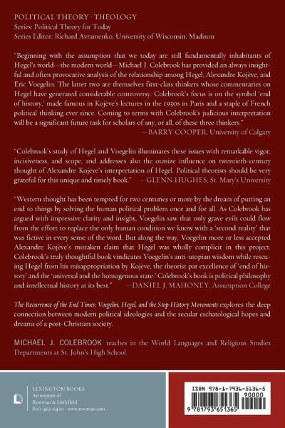 The Recurrence of the End Times: Voegelin, Hegel, and the Stop-History Movements explores the deep connection between modern political ideologies and the secular eschatological hopes and dreams of a post-Christian society. Focusing primarily upon the thought of 20th century German émigré political scientist Eric Voegelin, the book argues that we cannot understand the globalized world in which we live unless we appreciate the lasting influence of the various "End of History" speculators-specifically, G.W.F Hegel, Alexandre Kojève, and Francis Fukuyama. Through a Voegelinian lens, he dissects the relationship between these three thinkers, also claiming that while Voegelin may have misunderstood Hegel, his critiques of the Hegelian approach to history offer fresh and important perspectives on the contemporary world. This makes a forceful argument that the idea of history as a teleological path, leading toward some goal-whether perfect harmony between nations, a technocratic utopia, a return to some romanticized idyllic "state of nature," or what Kojève and Fukuyama called the "universal and homogenous State"-has vast, and perverse, implications for the trajectory of American foreign and domestic policy.