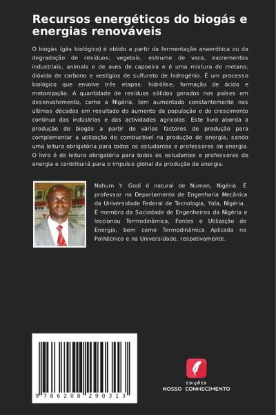 O biogás (gás biológico) é obtido a partir da fermentação anaeróbica ou da degradação de resíduos; vegetais, estrume de vaca, excrementos industriais, animais e de aves de capoeira e é uma mistura de metano, dióxido de carbono e vestígios de sulfureto de hidrogénio. É um processo biológico que envolve três etapas: hidrólise, formação de ácido e metanização. A quantidade de resíduos sólidos gerados nos países em desenvolvimento, como a Nigéria, tem aumentado constantemente nas últimas décadas em resultado do aumento da população e do crescimento contínuo das indústrias e das actividades agrícolas. Este livro aborda a produção de biogás a partir de vários factores de produção para complementar a utilização de combustível na produção de energia, sendo uma leitura obrigatória para todos os estudantes e professores de energia. O livro é de leitura obrigatória para todos os estudantes e professores de energia e contribuirá para o impulso global da produção de energia.