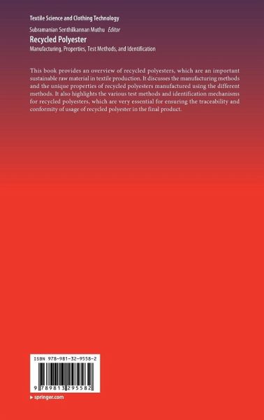 This book provides an overview of recycled polyesters, which are an important sustainable raw material in textile production. It discusses the manufacturing methods and the unique properties of recycled polyesters manufactured using the different methods. It also highlights the various test methods and identification mechanisms for recycled polyesters, which are very essential for ensuring the traceability and conformity of usage of recycled polyester in the final product.