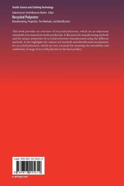 This book provides an overview of recycled polyesters, which are an important sustainable raw material in textile production. It discusses the manufacturing methods and the unique properties of recycled polyesters manufactured using the different methods. It also highlights the various test methods and identification mechanisms for recycled polyesters, which are very essential for ensuring the traceability and conformity of usage of recycled polyester in the final product.