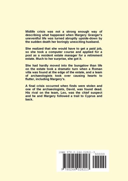 Midlife crisis was not a strong enough way of describing what happened when Margery Granger's uneventful life was turned abruptly upside-down by the sudden death her boringly unexciting husband. She realized that she would have to get a paid job, so she took a computer course and applied for a post as a resident estate manager for a retirement estate. Much to her surprise, she got it. She had hardly moved into the bungalow than life on the estate took a dramatic turn when a Roman villa was found at the edge of the estate, and a team of archaeologists took over causing hearts to flutter, including Margery's. A final crisis occurred when finds were stolen and one of the archaeologists, David, was found dead. His rival on the team, Leo, was the chief suspect and he and Margery followed a trail to Cyprus and back.