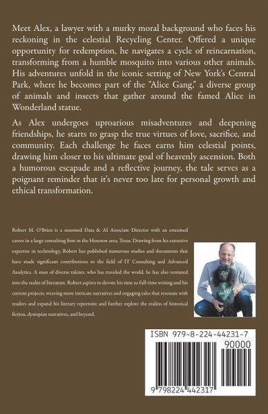 Meet Alex, a lawyer with a murky moral background who faces his reckoning in the celestial Recycling Center. Offered a unique opportunity for redemption, he navigates a cycle of reincarnation, transforming from a humble mosquito into various other animals. His adventures unfold in the iconic setting of New York's Central Park, where he becomes part of the "Alice Gang," a diverse group of animals and insects that gather around the famed Alice in Wonderland statue. As Alex undergoes uproarious misadventures and deepening friendships, he starts to grasp the true virtues of love, sacrifice, and community. Each challenge he faces earns him celestial points, drawing him closer to his ultimate goal of heavenly ascension. Both a humorous escapade and a reflective journey, the tale serves as a poignant reminder that it's never too late for personal growth and ethical transformation.