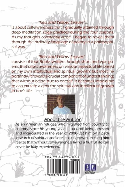 "Red And Yellow Leaves" is about self-awareness that I gradually attained through deep meditation Yoga practices during the four seasons. As my thoughts constantly arose, I began to reveal them through the ordinary language of poetry in a philosophical way. "Red And Yellow Leaves" consists of four Books written through short and epic poems that raises awareness on various aspects of life based on my own intellectual and spiritual growth; but most importantly, it reveals a crucial component of understanding; that without being true to oneself, it becomes impossible to accumulate a genuine spiritual and intellectual growth in one's life.